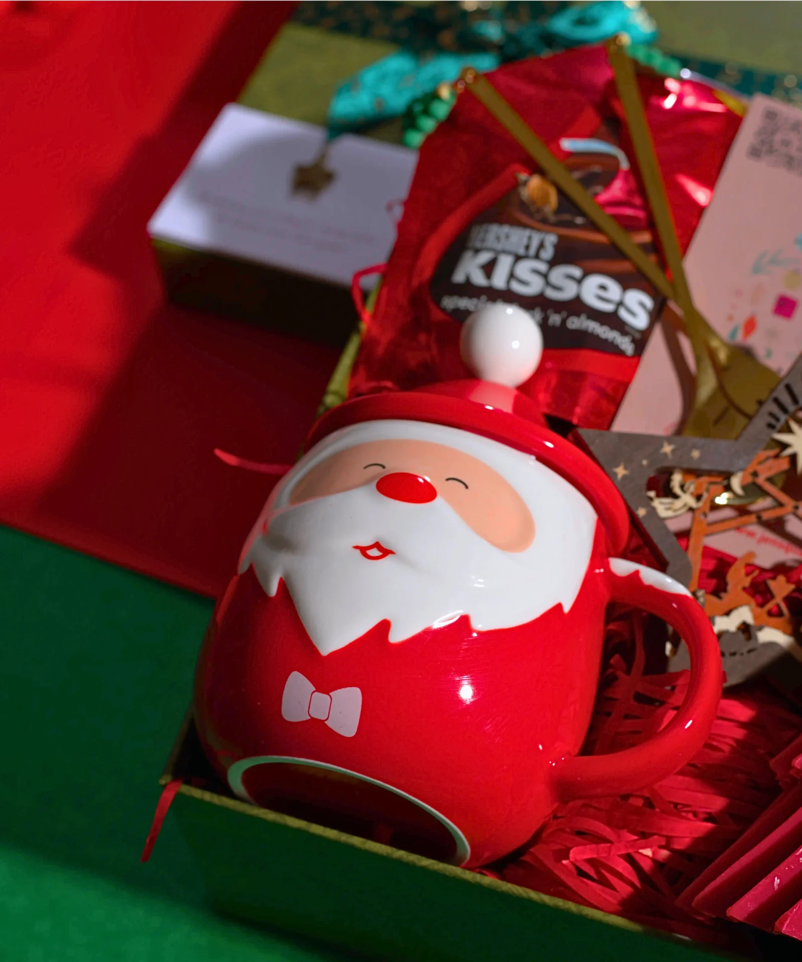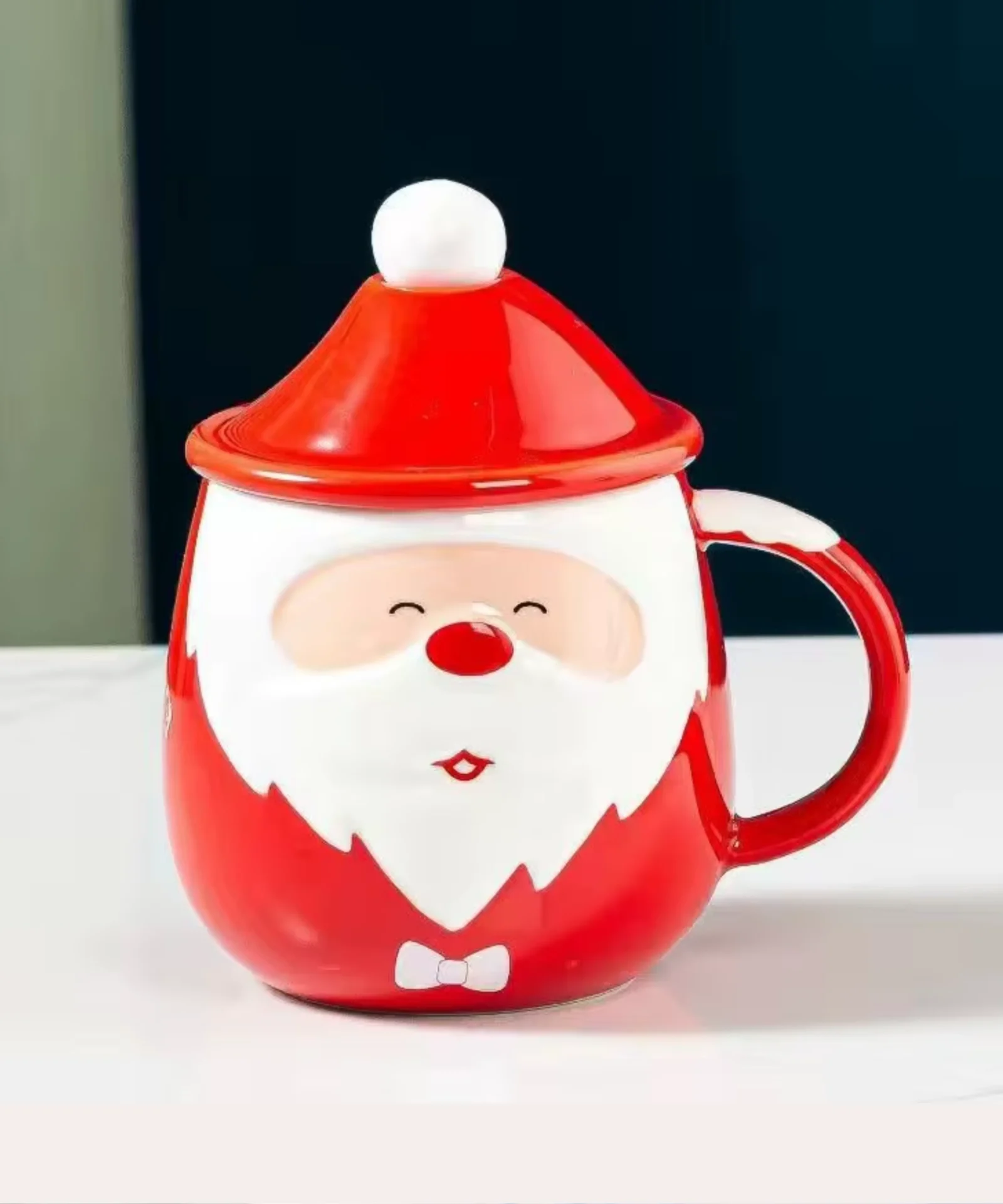 – A ceramic Santa cup with a lid and stirrer
