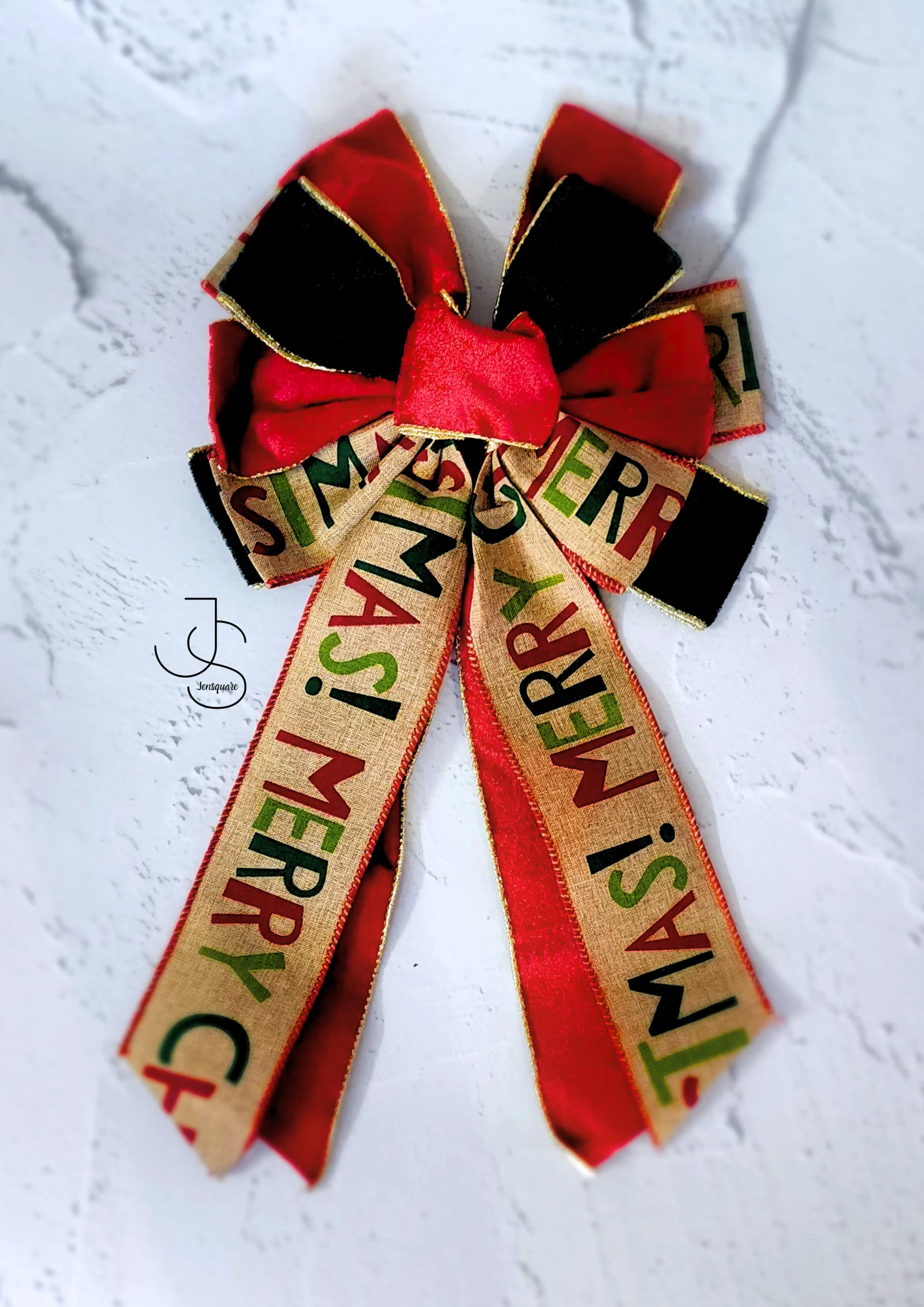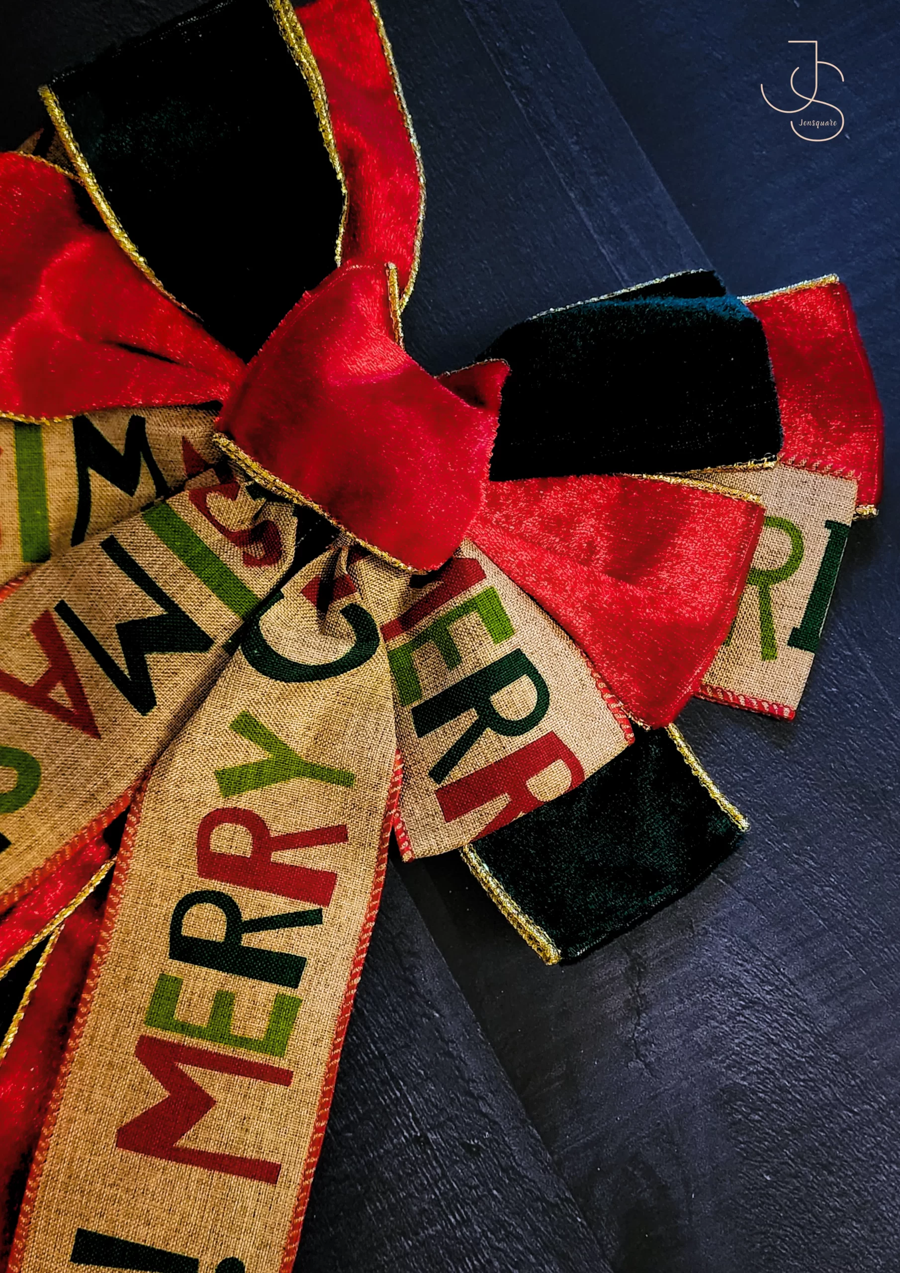 12 Loops made using red and green velvets and burlap ribbon with Merry christmas prints.