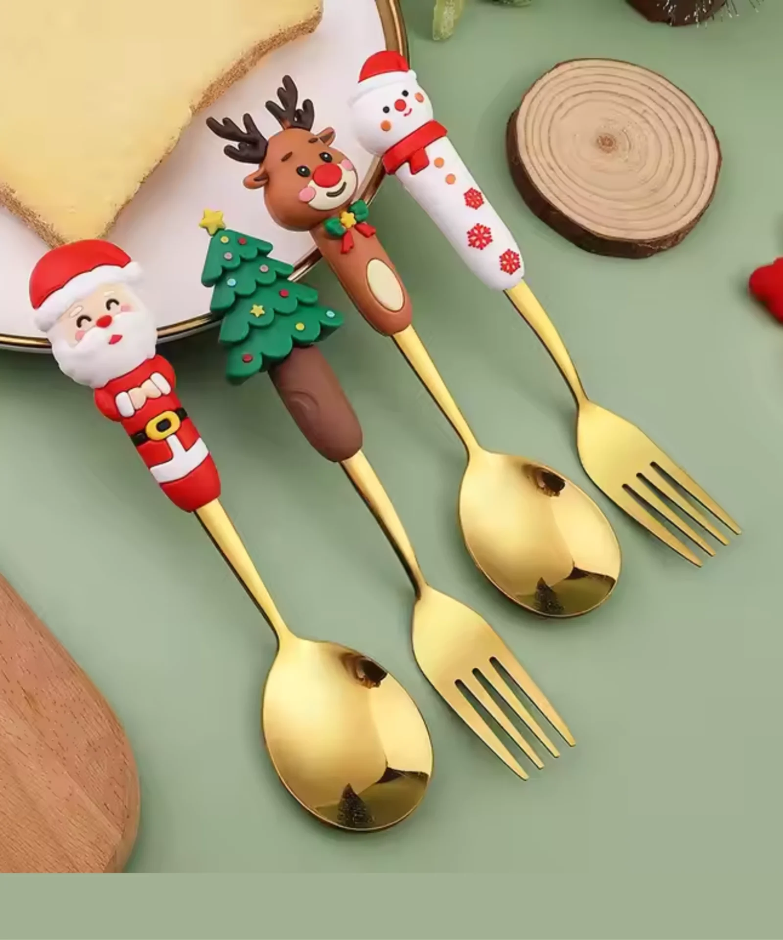 Transform your holiday meals with our Christmas Steel Spoon and fork Set! Crafted with durable steel, golden plating and Christmas themed silicon handles, these spoons feature festive holiday designs that will add a touch of charm to your table setting. From serving up delicious meals to stirring hot cocoa, our set is a must-have for any Christmas celebration.