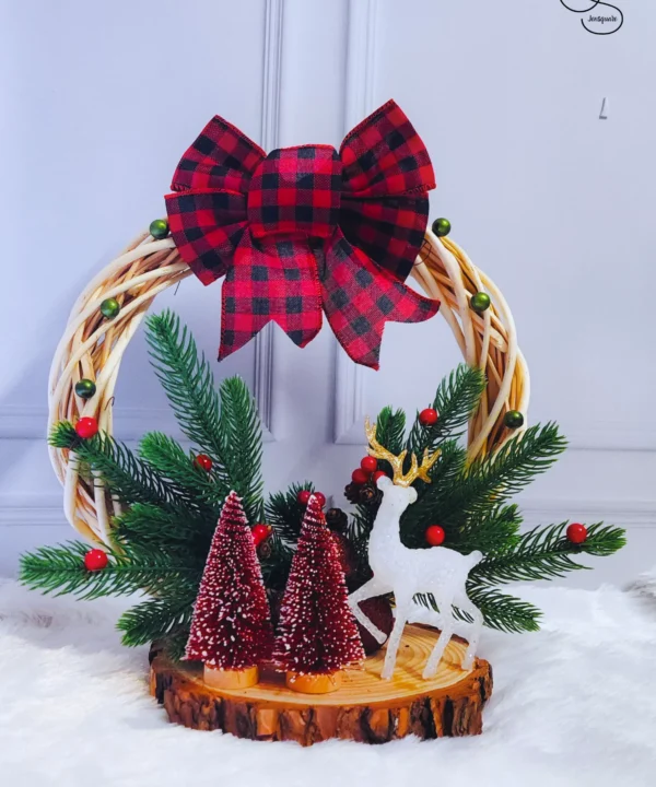 Christmas table top setup with reindeer and pine trees